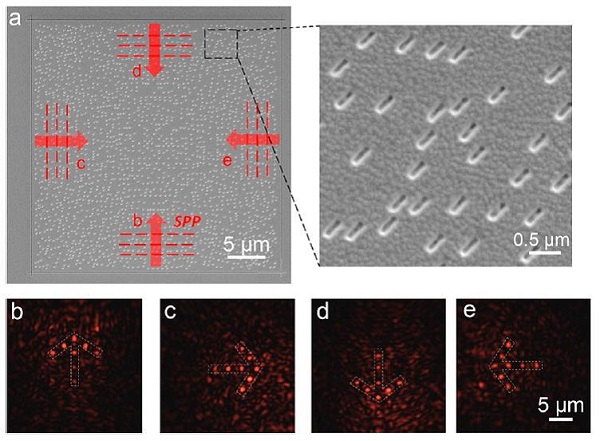 (b-e)实验测得由不同方向传播SPP所重构出的空间全息图