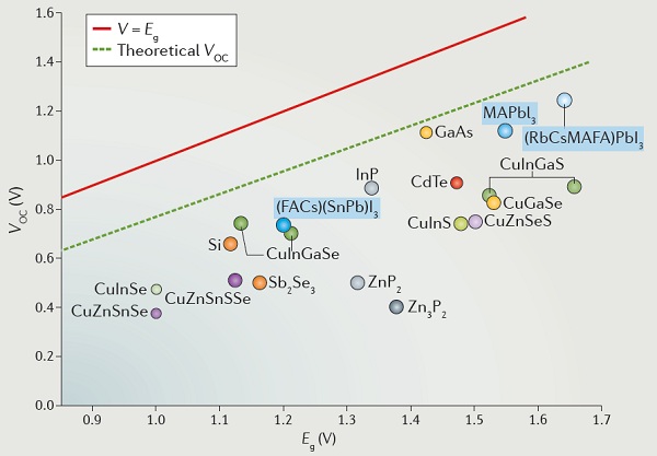 光伏材料需要具有较大的光吸收系数。吸收系数大的材料的活性层在很薄的情况下就能吸收带隙之上几乎所有的光子,减少载流子再结合导致的饱和暗电流,从而拥有较高的光捕获效率和较大的开路电压(VOC)。薄膜厚度和VOC之间的关系可以用肖克利-奎伊瑟模型(Shockley–Queisser model)表示: