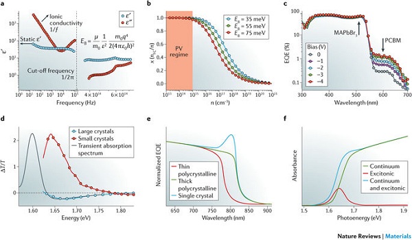 EB对微观结构敏感,在有较多小晶粒的钙钛矿薄膜中,无序、大小不一的电位会降低EB,抑制激子的产生。所以MAPbI3较强的激子峰只能在较大的单晶中出现。最新研究表明,激子更容易在高结晶度的地方产生,自由电荷在有较多小晶粒的晶粒中心出现。