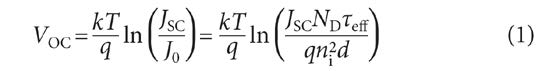 其中,k为玻尔兹曼常数,T为温度,q为元素电荷,JSC为短路电流密度,J0为起始电流密度,ND为掺杂密度,τeff为载流子复合寿命,ni为本征载流子浓度,d为吸收层的厚度。