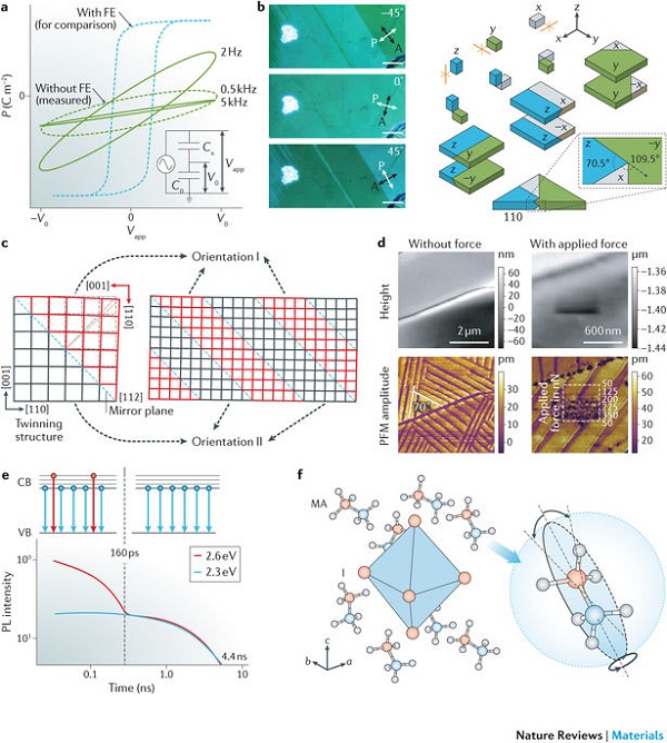 还有一些其它的机制用来解释OIHPs的光生电子空穴复合较慢的原因。一些研究者假设钙钛矿可能具有铁电性,产生极化电场,从而将电子-空穴分离开。有研究通过压电力显微镜(PFM)在钙钛矿结构中观察到域结构。但是在排除掉电荷泄露的影响后,通过经典Sawyer–Tower电路方法,没有检测到MAPbI3中存在稳定的磁化现象(图3a)。通过微纳技术证实了在MAPbI3多晶薄膜和单晶中的铁弹性性能(图3b)。通过偏光显微镜和PFM观察到了明显的70°和109°的畴壁,这些畴壁可能是由于正方晶系MAPbI3中不同取向的孪晶畴的存在而产生的(图3c)。一些研究通过偏光显微镜和PFM在单晶和多晶薄膜中观察到铁弹畴运动(图3d)。研究者也研究了有机阳离子在载流子复合中的作用。研究表明,尽管有机阳离子的类型对带边复合没有明显的影响,但有机阳离子在载流子的热化方面起到了较大的电荷屏蔽作用(图3e,f)。