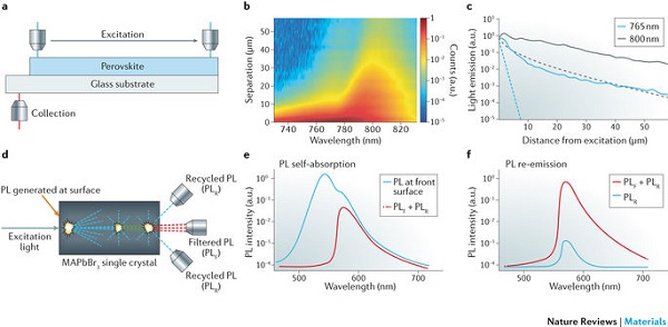 最近,一个研究首次证实了MAPbI3多晶薄膜的光子循环效应。研究表明,多晶薄膜中有大于50μm的光吸收区存在光生电荷(图4a-c)。与此同时,根据它们的极化差异区分发射和重吸收光子的方式,确定单晶OIHPs的光子循环效率。研究表明,晶体的光致发光信号占主导地位,重吸收和重发射很弱(图4d-f)。在这些体系中,光子循环效率少于0.5%,这对于太阳能电池来说可以忽略。较低的光子循环效率可能是由于钙钛矿薄膜较低的内PLQY造成的。