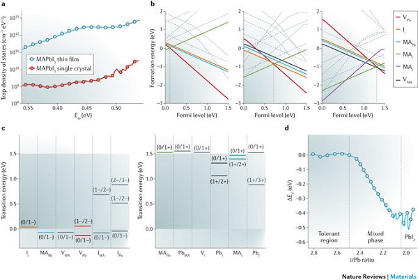 一般认为,在OIHPs太阳能电池中,较低密度的电荷陷阱使其具有较大的VOC。不过,现阶段对电荷陷阱的认识还处于初步了解阶段。尽管大部分OIHP器件是低温溶液法合成的,其缺陷浓度比很多多晶无机物太阳能电池小。图5b和c为计算所得的MAPbI3的可能的点缺陷。所有可以形成深能级的点缺陷均具有较大的缺陷形成能,不会影响器件的性能,而大部分存在于体相MAPbI3中的点缺陷会形成浅能级。另外,研究表明,即使薄膜中的I离子损失20%,MAPbI3的能级也不会改变(图5d)。