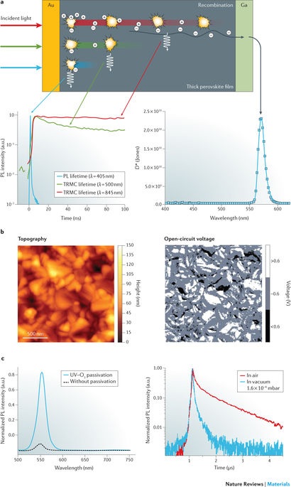OIHPs材料中,除了点缺陷,晶界和界面处的扩展缺陷也增加了缺陷浓度。晶界和表面处的原子不是严格按照化学计量,这造成此处的缺陷浓度较高。例如,退火后,晶体表面有机成分的挥发会造成表面较大的缺陷密度。甚至OIHPs单晶的表面都存在较多的缺陷,表面光生载流子的复合会终止短波长光的光响应。只有光生电荷的能量与能带接近时才会造成光响应。这种表面复合也可以解释钙钛矿单晶的荧光寿命随着光的不同穿透深度而改变的现象(图6a)。