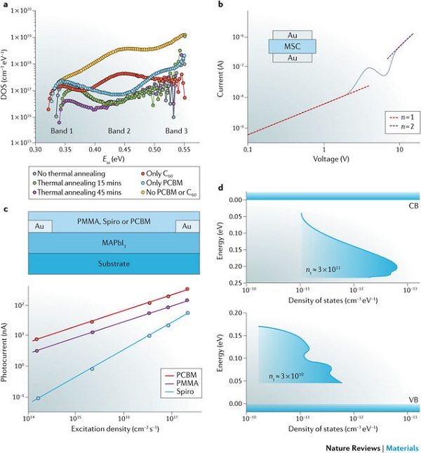 OIHPs材料的电荷缺陷密度的准确表征对于理解相关的光电特性至关重要。现阶段仍有很多缺陷数据未知。较早的用来检测缺陷密度的方法为热导纳谱法,这种方法能给出不同深度能级处的缺陷态密度。研究表明,MAPbI3多晶薄膜与PCBM和C60的物理接触可以将浅能级和深能级降低1~2个数量级,表明缺陷主要在薄膜的表面(图7a)。为了了解单晶的内部缺陷密度,通过陷阱填充空间电荷限制电流方法来评估缺陷密度(图7b)。