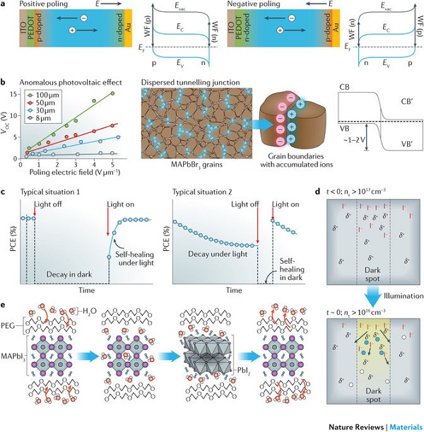 离子迁移是OIHPs区别于其它光伏材料的独特性能。本文主要关注离子迁移对器件效率和稳定性的影响。离子迁移和聚集可以形成化学掺杂效应,这是具有p–i–n或n–i–p结构的高效太阳能电池的欧姆接触的结果(图8a)。最近的一项研究显示,n–i–p结构的太阳能电池存在反常光生伏打效应(图8b)。在MAPbI3、MAPbBr3和CsPbBr3作为活性层的太阳能电池中均观察到了这种效应。一些研究表明,离子迁移有利于提高材料的短期稳定性,但会削弱钙钛矿太阳能电池的长期稳定性。图8c表明,器件在光照下性能衰减,在暗处放置一段时间后,性能可以部分或完全恢复。这种自愈效应很可能与离子迁移有关(图8d)。由于离子在薄膜中迁移所用时间(几秒或几分钟)比薄膜老化时间(几天或几个月)短很多,MAPbI3和PbI2之间的晶相转变促使可逆的离子迁移,所以离子迁移有“修复”局部晶格畸变的作用。离子迁移引起的自愈需要密封样品,防止物质挥发以及表面与空气中物质发生化学反应。一些研究将MAPbI3薄膜的晶界用聚乙烯醇填充,防止MA+阳离子的挥发,从而起到增强器件稳定性的自愈效应(图8e)。