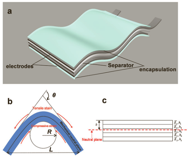 LIB由两个封装层,两个集电器,两个电极,分离器/电解质等组成。如果作为机械梁的基片弯曲到半径为R的圆柱体中,则外表面承受拉伸应变并且内表面承受压缩应变。在设备内部存在没有单轴应变的机械中性平面,该平面的位置与每个层的杨氏模量和厚度有关。将刚性膜放置在机械中性平面上可实现超柔性。考虑到材料性能(如弹性模量和泊松比)的差异,弯曲力学在多层结构中是复杂的。刚性膜和柔性衬底的不匹配导致了膜上或层之间界面的应力集中。