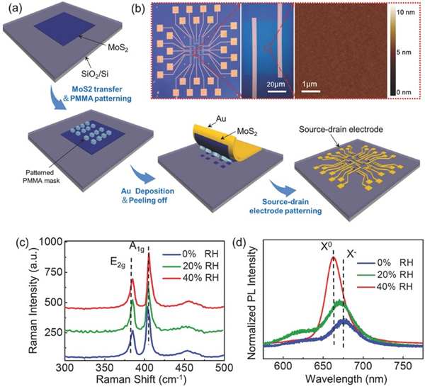 二维材料由于其超高的表体比、优异的机械性、柔性透明等特性而在湿度传感器领域显示了巨大的应用前景。以二硫化钼为代表的过渡金属硫属化物由于其优异的电流开关比、迁移率等特性为其在电子学器件中的应用提供了可能。由于二硫化钼本身是一种N型半导体,因此当其表面吸附水分子时,相当于对其进行了P型掺杂,其电学性质会表现出相应的变化。现阶段对二硫化钼湿度传感器的研究主要受制于加工过程本身引入的残胶对材料表面的污染,从而影响了其对水分子的吸附导致灵敏度不高或响应时间过长等问题。因而如何得到具有高灵敏的二硫化钼湿度传感器成为制约其应用的最主要原因。
