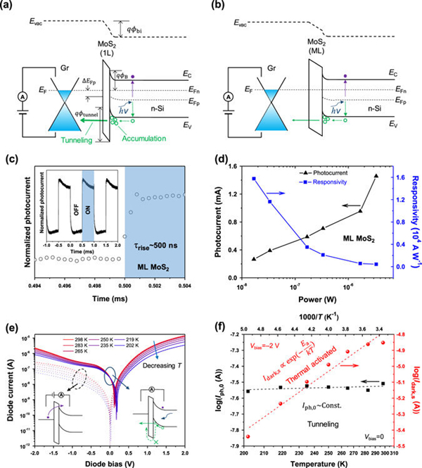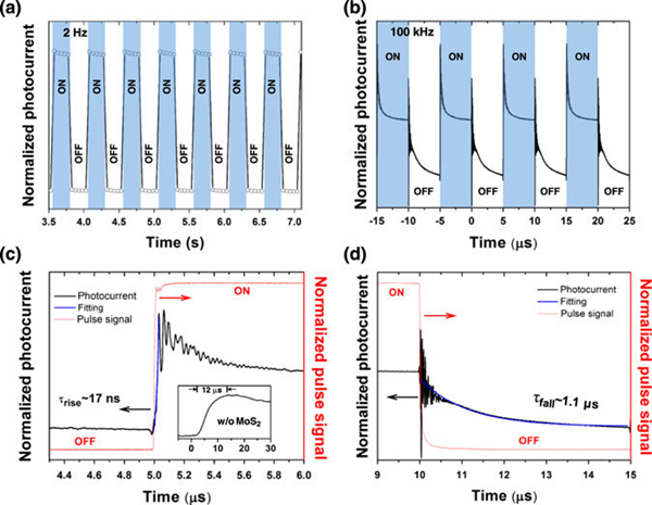 (c, d) 界面钝化层为多层二硫化钼的器件的暂态响应和光电流-光功率关系
