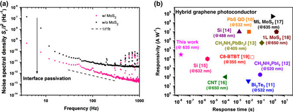(a) 加入与未加入单层二硫化钼钝化层的器件的噪声谱密度-频率关系对比