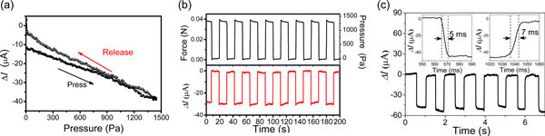 压电纳米线可以把微弱的压力信号转化为电信号同时具有微秒级的反应速度,有望在压力传感器中得到应有。 然而, 压电纳米线的对压力反应的电信号是以脉冲形式存在, 即只有在压力施加的过程才有电信号的产生, 一旦施加压力稳定, 其电信号就会消失。这种现象使得压电纳米线只能作为动态信号响应的压力传感器, 而不能用做静态压力的测量。