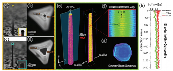 e) 这根纳米线和沿轴向切开的三维原子探针重构图 (黄色原子为Ga原子,紫色原子为In原子)