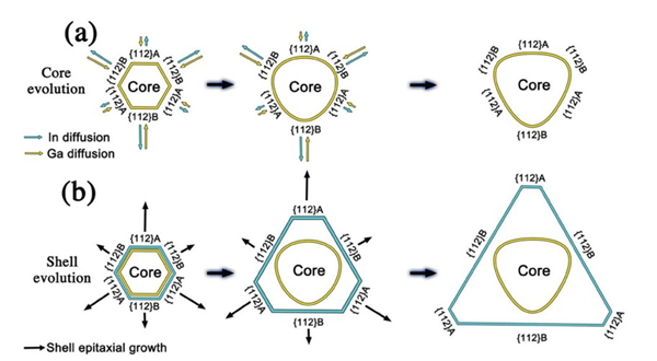 近日,悉尼大学郑荣坤副教授(通讯作者),第一作者屈江涛博士与团队成员克服了半导体纳米线的原子级别成分探测的难题,通过使用三维原子探针技术和第一性原理计算在原子级别,揭示并解释了III-V族 InGaAs纳米线形貌和元素成分的演变过程。其研究表明InGaAs纳米线自发形成壳层结构,其中In富集在壳层,Ga富集在中心核层。同时In向壳层扩散与Ga向中心核层扩散导致中心核层从六边形向Reuleaux三角形转变。另外不规则六边形壳层在{112}A和{112}B上存在不同生长速度。该研究将为半导体纳米线的生长调控提供研究基础。该研究成果以“3D Atomic-Scale Insights into Anisotropic Core-Shell-Structured InGaAs Nanowires Grown by Metal-Organic Chemical Vapor Deposition”为题刊登在2017年6月19日出版的Advanced materials上。