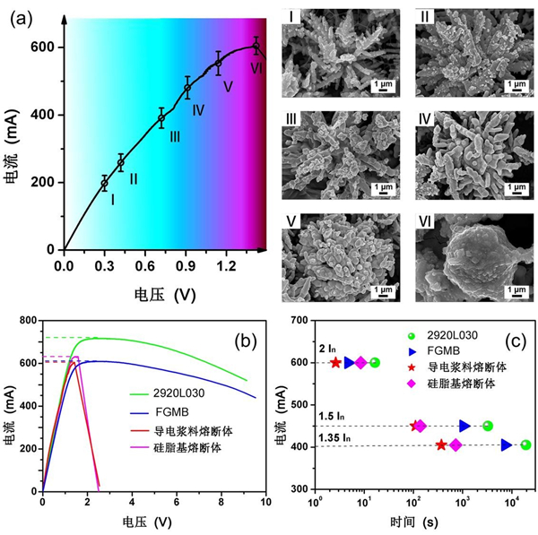 图4. (a)在新型的保险丝两端逐步增大电压,电流随之平缓上升,上升至1.4V时发生明显下降,说明保险丝已断开,同时可观察到在不同电压下银粉的SEM形貌变化;(b)在同样的串联电路条件下,对四种额定电流规格均为600mA保险丝进行熔断测试;与商业保险丝(2930L030与FGMB)相比,两种新型熔断体的熔断响应时间更短、熔断电流精确;(c)在负载不同程度的过载电流条件下,新型熔断体的熔断时间均比商业保险丝短。