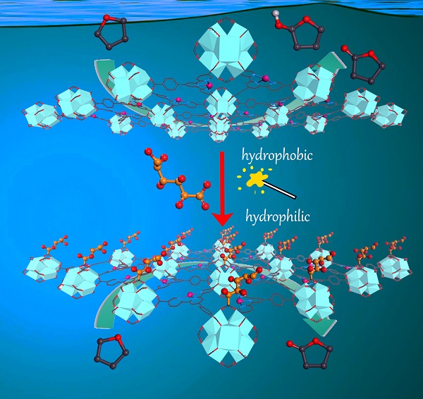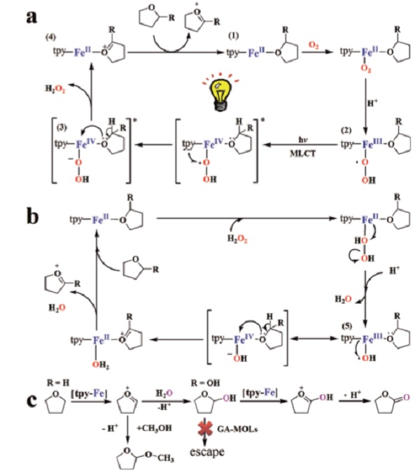 酶催化的高效性和专一性与其可调变的活性中心微环境密不可分。基于这个自然界的模版,科学家用金属有机框架(MOF)空腔模仿酶的疏水口袋,可望达到相似的催化效果,然而对这类仿生孔道的化学修饰受限于MOF的孔道大小。该课题组最近发展了二维金属有机单层(MOL),对MOL次级结构单元(SBU)的后修饰无孔道限制,更具可设计性。基于三联吡啶三羧酸(TPY)配体的MOL,通过SBU修饰亲疏水单羧酸基团,调控催化的亲疏水微环境,并在TPY上修饰过渡金属铁活性中心,模仿氧化酶的催化结构,以氧气为氧化剂,高效地将四氢呋喃选择性氧化成丁内酯。通过修饰不同的亲疏水基团,四氢呋喃的氧化产物也随微环境的变化而变化。