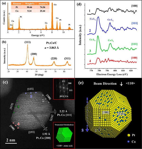 (a) EDS结果确认化学成分;(b) XRD表征结果;(c) 球差矫正HAADF-STEM对单个Pt3Co颗粒的表征结果;(d) STEM-EELS结果显示:Pt3Co颗粒{111}表面的Co元素含量高于{100}表面;(e) 图(c)颗粒所对应的原子模型示意图。