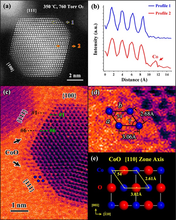 (a-b) 原位HAADF-STEM表征与Z衬度分析显示:氧化环境下,Pt3Co颗粒中的Co元素偏析至{111}表面,而非{100}表面;(c-e) 原位球差矫正STEM像确认{111}表面形成的氧化层为CoO。