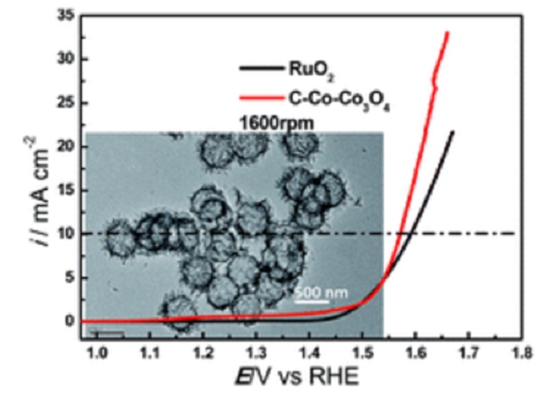 IR补偿后的碳掺杂Co/Co3O4的空心球异质复合纳米材料在1M KOH溶液中的极化曲线,插图为复合材料的透射照片