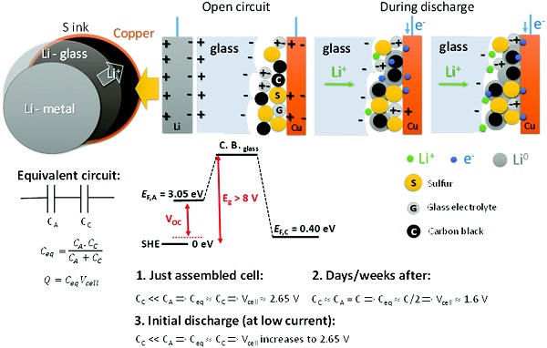 传统电池使用的是液态电解液以及金属氧化物作为正极材料,同过阳离子在固液界面通过循环性的迁移实现电化学储能。锂电池有机电解液的带隙窗口是 ,但是它的LUMO低于碱土金属并且易燃。如果电池负极的电压(费米能级)低于锂金属的费米能级(1.3 eV)就会在电池的负极形成一个SEI膜来防止电解液在负极放生还原反应。当高电压的锂离子电池的SEI膜中的锂来自于正极材料时会降低电池的容量。目前,市场上使用的移动设备的电源绝大部分使用的是碳负极,但是它的体积容量很低,并且正极的氧化物在工作电压高于4.3 V (vs. Li+/Li)时,材料的结构会变得不稳定。因此,需要一个昂贵的系统来管理复杂的电池充放电过程。人们尝试使用锂合金负极来提高电池的体积容量,但是失败了。金属钠由于价格低廉,并且易得,引起了人们的注意。但是钠电池的容量普遍低于锂电池,并不能达到目的。