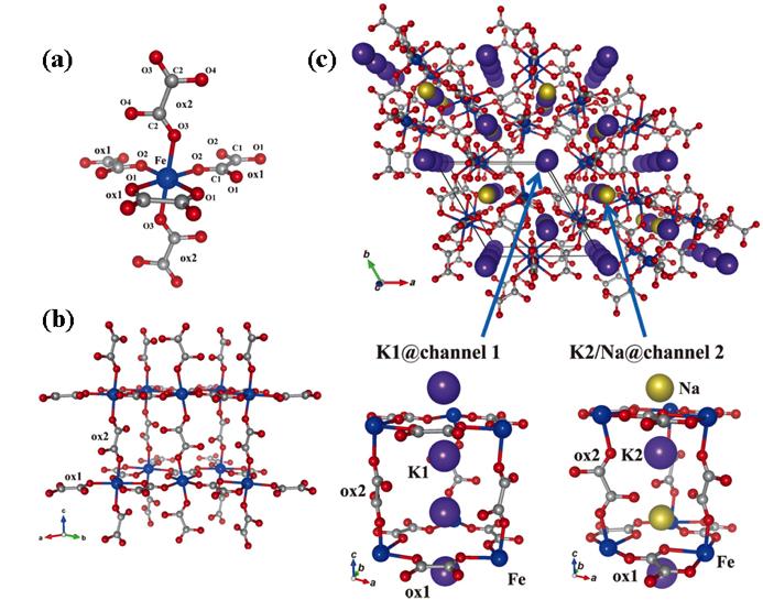 图1. K4Na2[Fe(C2O4)2]3.2H2O的晶体结构示意图:(a)铁原子附近的配位结构示意图。(b)三维草酸铁骨架示意图。(c)钠离子在K4Na2[Fe(C2O4)2]3.2H2O中的脱/嵌通道结构示意图。