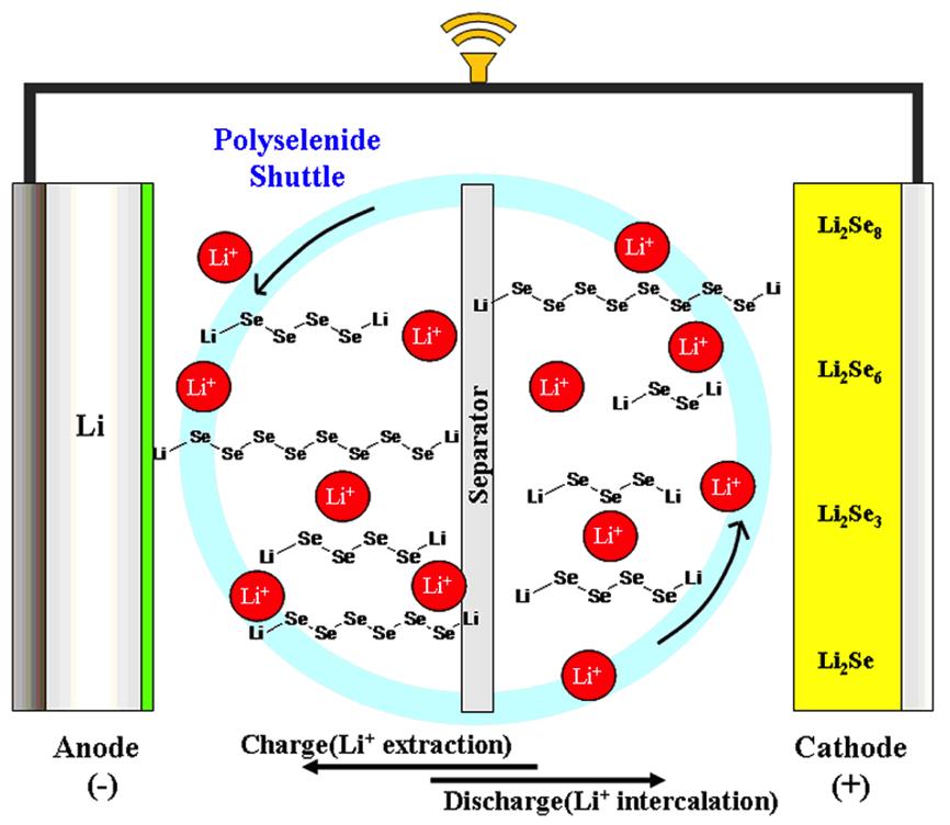 锂硒电池因其具有高的体积比容量(3253 mAh cm-3)及质量比容量(678 mAh g-1),也成为具有发展潜力的新型高能电池之一。图3所示为锂硒电池的工作原理示意图。同锂硫电池一样,锂硒电池同样有着寿命短、效率低的缺点。本章节主要介绍了由MOFs衍生出的碳材料以及掺氮碳材料作为硒的基底材料的相关工作(利用碳材料的导电性和孔道对多硒化物的物理吸附来改善电池性能)。同时提出MOFs在锂硒电池正极中具有类似于图2所示的化学吸附作用机制。