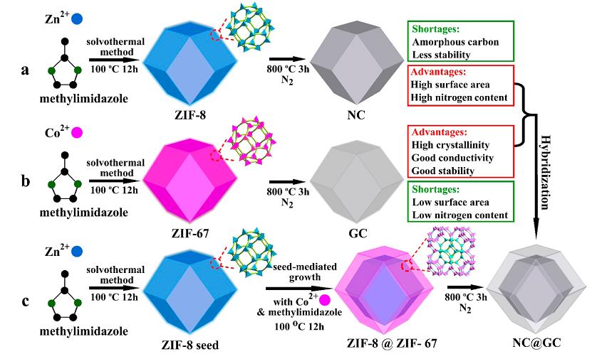 图4. (a) ZIF-8和氮掺杂的碳制备示意图。(b) ZIF-67和石墨化的碳制备示意图。(c) ZIF-8@ ZIF-67和氮掺杂的非晶型碳@石墨化碳制备示意图。