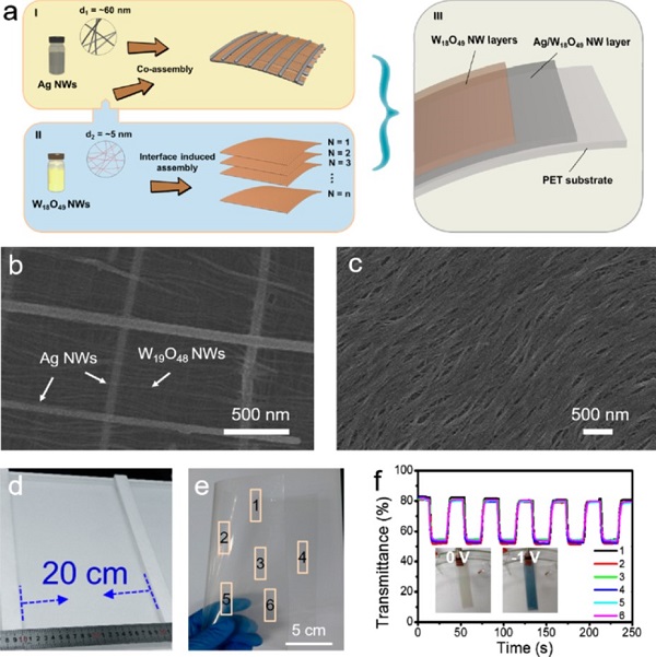 电致变色器件在不同偏压下会表现出不同的光学性质,因而在智能窗户、防炫目后视镜、电子显示等领域具有广阔的应用前景。传统的柔性电致变色器件主要是制备在氧化铟锡(ITO)电极上,实际上远未达到柔性的概念。近年来,金属纳米线(NW)、石墨烯、碳纳米管网格成为了制备柔性透明电极的热点,但碳纳米管和石墨烯制备的柔性薄膜在光学透过率为80%~90%时,电阻仅为100~1000Ω/sq,很难满足大多数的应用。相比而言,基于金属NWs的薄膜具有高的导电率和光学透过率,被寄予厚望。与无序的NW结构相比,通过操控NW组装形成宏观尺度的组装体才能精确地调控和平衡柔性透明电极的光学透过率和导电性。因此,如何有效地操控NWs的组装制备柔性器件成为了该领域研究的热点。