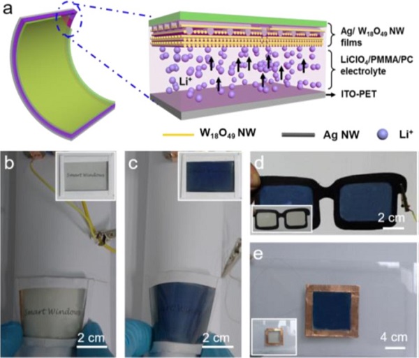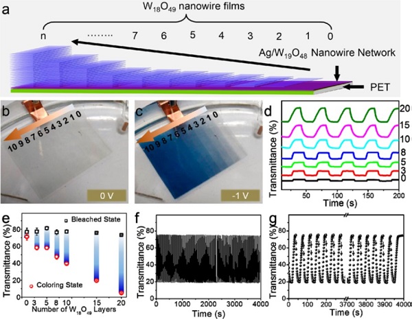 (a)柔性Ag/W18O49纳米线薄膜的电致变色示意图;