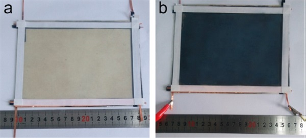 尺寸为18cm×15cm的固态柔性电致变色器件实物图。