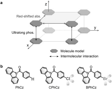a)在固态下,可见光激发的超长磷光的分子间相互作用的示意图;