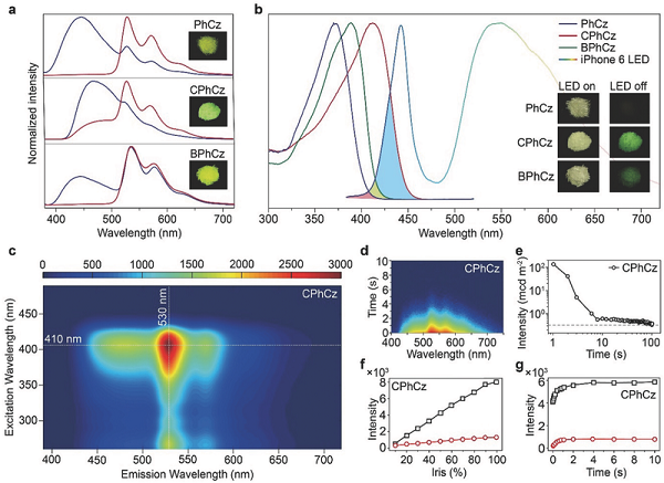 f,g)激发强度和激发持续时间对CPhCz的稳态光致发光(黑线)和超长磷光(红线)的影响。