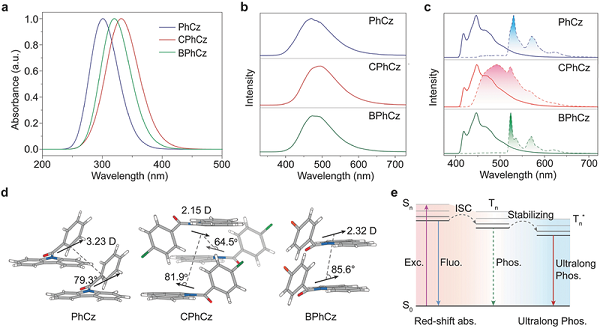 a)PhCz,CPhCz和BPhCz的稳态荧光(蓝线)和超长磷光(红线)光谱。插图:PhCz,CPhCz和BPhCz在365 nm紫外光下的照片;