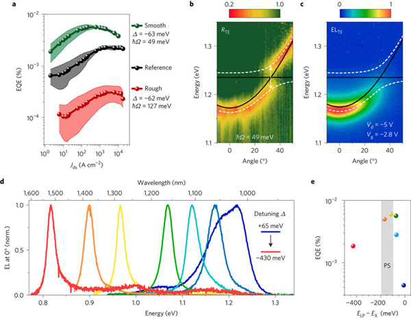 (a)腔内嵌LEFETs的外量子效应在高耦合作用结构中呈现粗糙和平滑的SWCNT层;
