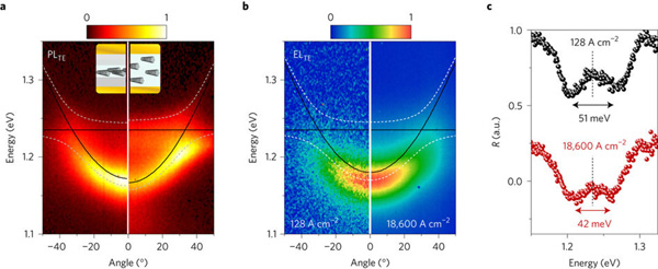 (c)反射率在角度为29º且高电流密度下表现出Rabi分裂减小了17%,但仍然具有强耦合作用,虚线表示激子能量。