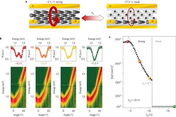 (a)在低栅极电压条件下,不带电的SWCNTs耦合作用强弱的调谐示意图;