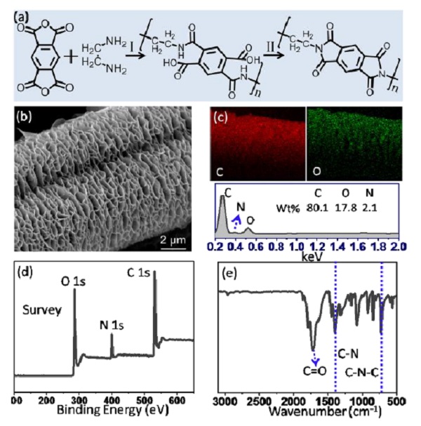 (a)PEBCD的两步合成路线图示:I)溶液聚合,II)热处理。