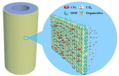 图1:以管状氧化铝为基质的MOF/ 有机硅纳米复合材料膜上用于气体分离示意图。