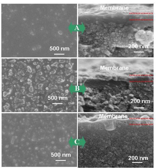 (B) MIL-53-NH2/有机硅薄膜扫描电镜的图像的表面和横截面视图;