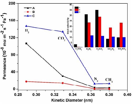 (A) ZiF-8/有机硅薄膜对H2 ,N2,CO2 和CH4 的通量;