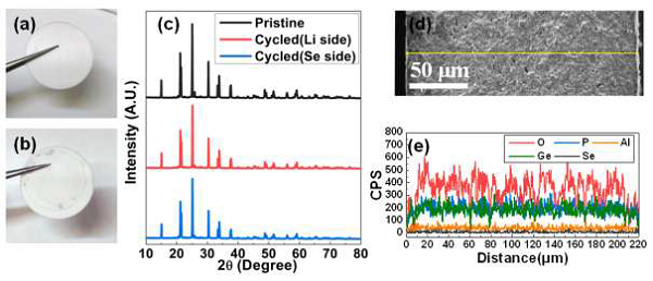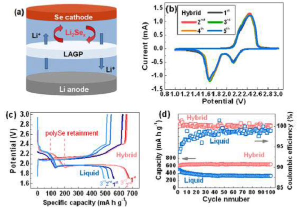 近日,香港中文大学的卢怡君教授(通讯作者)等在Nano Energy发表了一篇题为“A stable lithium−selenium interface via solid/liquid hybrid electrolytes: blocking polyselenides and suppressing lithium dendrite”的研究论文,报道了采用固/液混合电解质稳定锂-硒界面的最新研究成果。研究团队采用熔融扩散法制备得到了硒-科琴黑(Se-KB),硫-科琴黑(S-KB)正极材料,采用固相反应法制备得到了NASCION结构型Li1.5Al0.5Ge1.5(PO4)3固态电解质(LAGP),然后将LAGP包夹在四甘醇二甲醚(TEGDME)电解质中,得到三明治结构的混合电解质。研究人员将制备的电极材料(Se-KB)和混合电解质组装成半电池,进行电化学性能测试,实验结果表明:使用固/液混合电解质可以有效稳定Li-Se电池的电极-电解质界面,限制多硒化物的穿梭,抑制锂枝晶的生成,提高Li-Se电池的电化学性能。当电流密度为0.1 C时,电池的可逆放电容量为677 mAh/g,硒的利用率接近100 %;电池的稳定性较好,在0.8 C电流密度下循环500圈后容量仍可维持在613 mAh/g,每圈的容量衰减率仅为0.008%;电池的倍率性能也较为突出,在1.5 C的放电倍率下,容量仍可高达540 mAh/g。因此,采用固/液混合电解质有望提高Li-Se电池的循环稳定性和电化学性能。