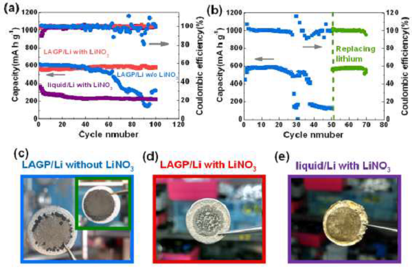 (a) 固/液混合电解质和液态电解质锂离子电池的充放电容量和库仑效率曲线LiNO3, 0.8 C, 不含LiNO3, 0.6 C);