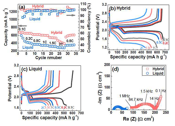 (a) 混合电解质和液体电解质Li-Se电池的倍率性能曲线;