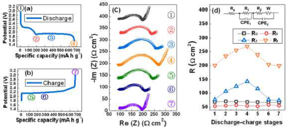(c) EIS数据(点符号)和各种放电/充电阶段的拟合结果(实线);