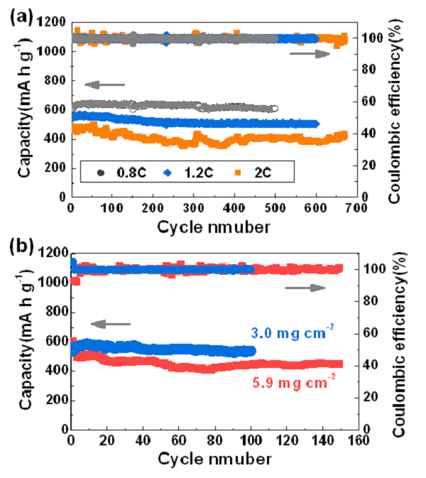 (b) 高硒负载量混合电解质Li-Se电池的充/放电容量和库伦效率保持率曲线(负载量为3 mg/cm2 时电流密度为0.5 C, 负载量为5.9 mg/cm2时电流密度为0.15 C)。