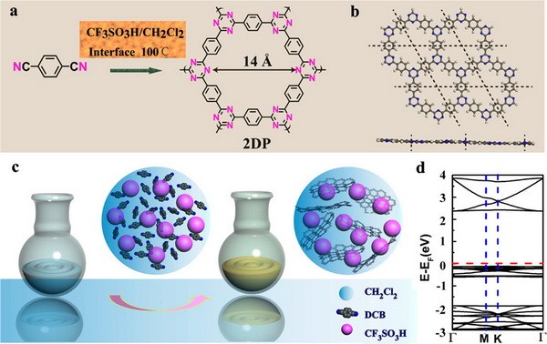 (a)二维含三嗪高分子的合成路线图,主要利用了1, 4-间苯二腈在二氯甲烷和三氟甲磺酸的界面发生腈三聚反应合成;
