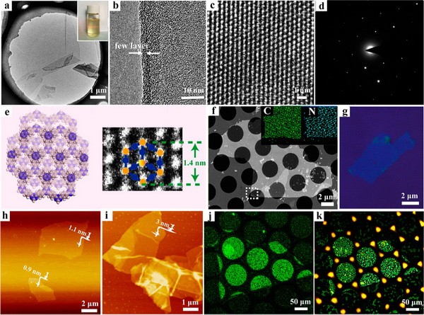 (a)悬浮的二维含三嗪高分子薄膜的照片,插图是其在紫外灯下的荧光图像;