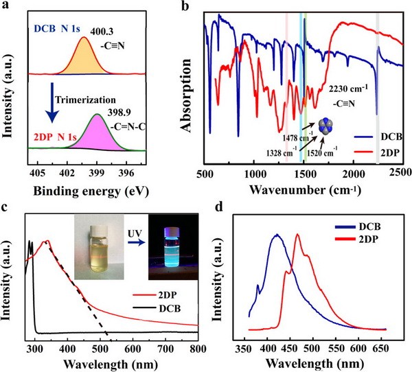 (c)间苯二腈和二维含三嗪高分子的紫外光谱图,插图展示了二维含三嗪高分子分散液在放置紫外灯下前后的照片对比;
