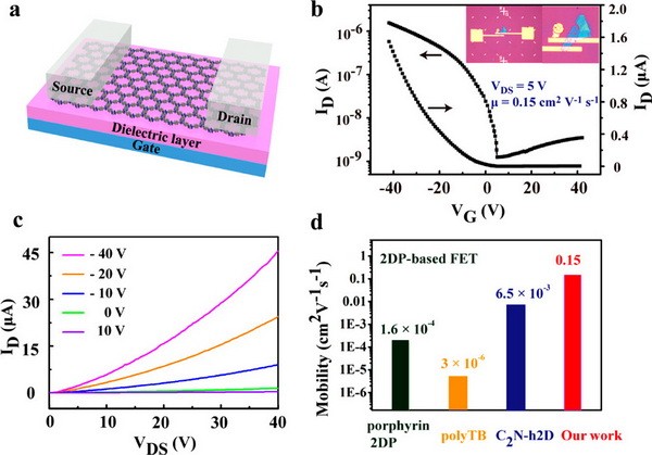 (a)以二维含三嗪高分子作为半导体层的场效应管器件示意图;