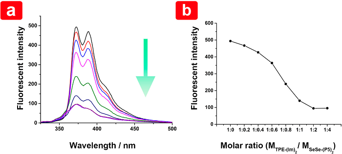 (b) 372nm处的荧光强度与TPE—( Im)— 2和SeSe—( P5)— 2的摩尔比的曲线图。