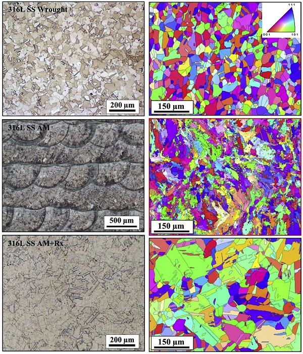 顶部:退火锻造316 SS;中间:AM 316L SS;底部:AM 316 SS 再结晶热处理,1060℃,1小时。